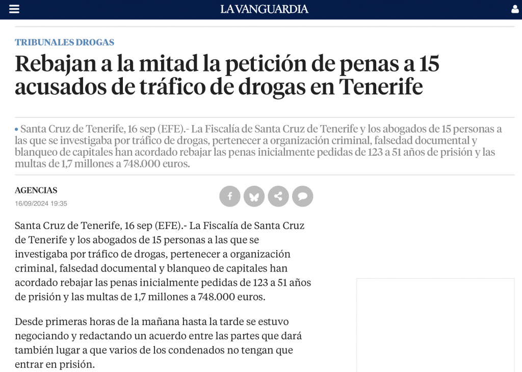 El prestigioso medio nacional La Vanguardia publicó una noticia sobre la reciente reducción a la mitad de la petición de penas para 15 acusados por un caso de tráfico de drogas en Tenerife, un hecho que ha generado atención jurídica y social en la isla. En este contexto, Abraham Hernández Pérez, director de Hernández Abraham Abogados y abogado penalista en Santa Cruz de Tenerife, fue abogado de la defensa y obtuvo una reducción de las penas a la mitad para sus clientes.